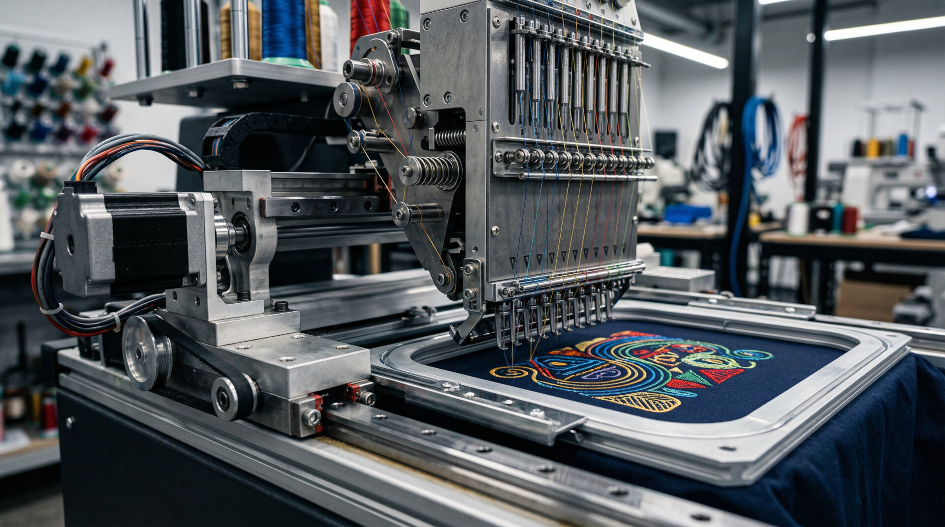 El corazón de la máquina industrial es su sistema multihilo y multicabeza. Cada cabeza de bordado cuenta con un juego de agujas (generalmente entre 12 y 15) que permiten alternar colores de forma automática sin detener la producción. La tensión del hilo se regula mediante discos micrométricos y sensores de rotura; si un hilo se corta o se agota, la máquina se detiene instantáneamente para evitar inconsistencias en el diseño. Esta gestión de la tensión es lo que permite que el bordado tenga ese relieve característico y una superficie uniforme.